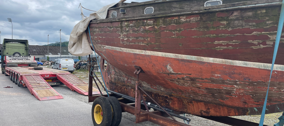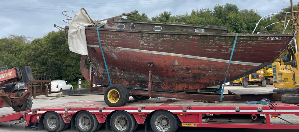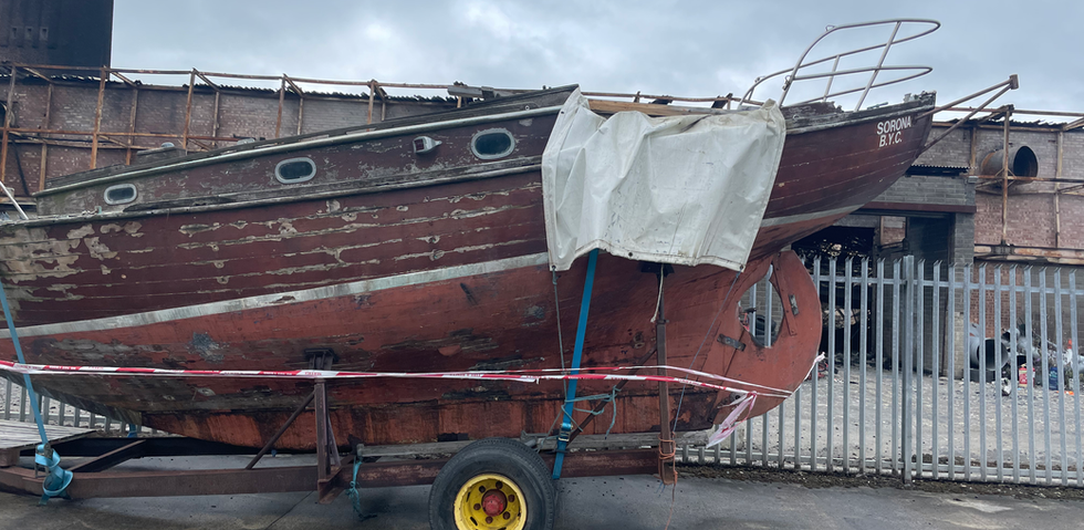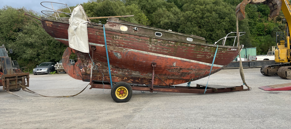“I found the boat in July 2024 and purchased it from Gerry Brennan in October, the week of my twenty-fifth birthday no less. I first saw Sorona when my family's demolition company went to take down a burnt warehouse in an industrial estate beside where we live. The boat was sitting on its trailer against the gable wall of one of the torched buildings. Astonishingly, the boat was the only thing on site completely untouched by the fire, and it's also amazing that the crumbling brick wall didn't fall on top of it either. We moved the boat from the immediate danger and after a few of months of searching for the owner, I done a deal with him for the boat and trailer including an aluminium mast (saying as the original wooden mast was long gone)...